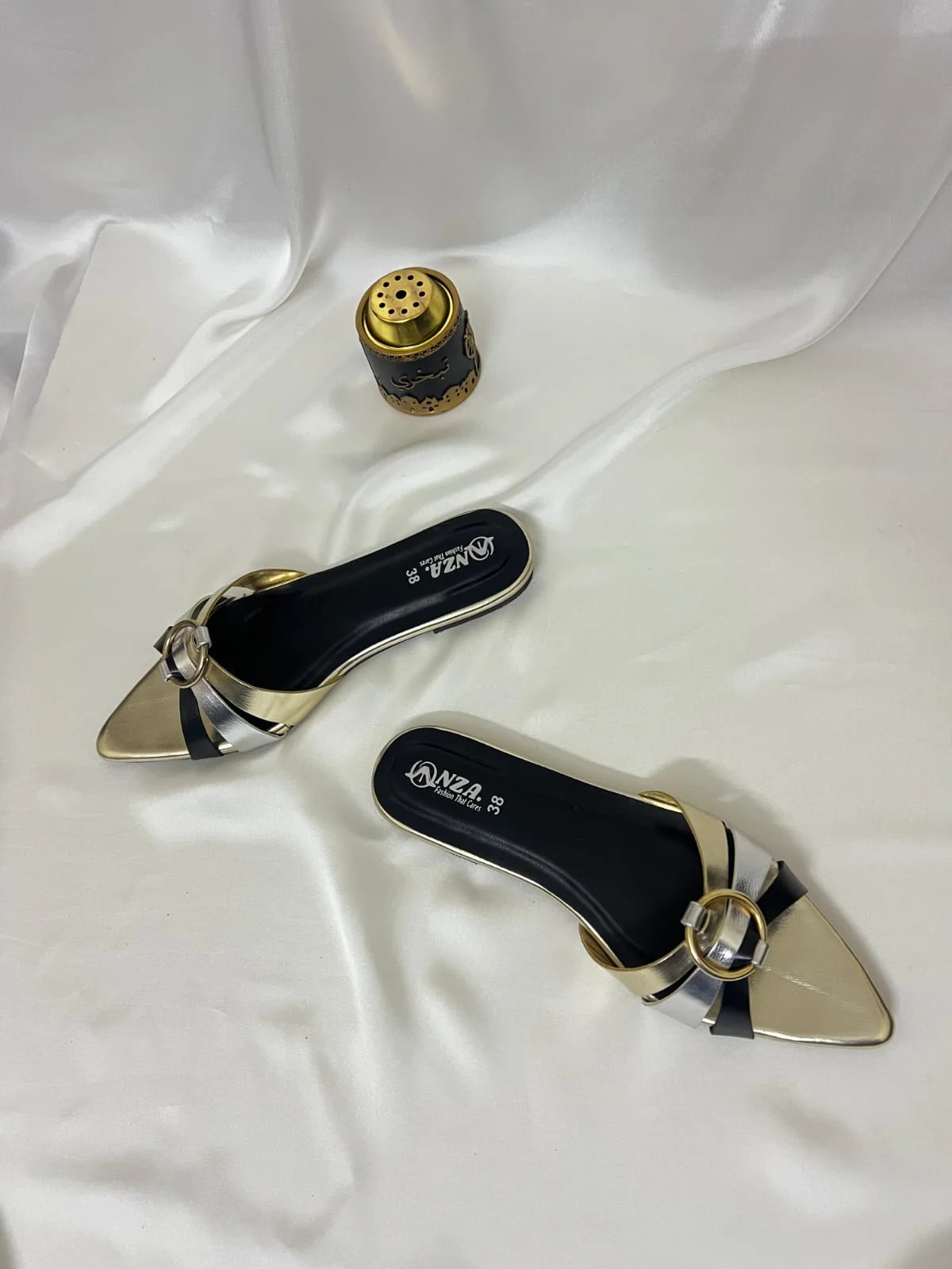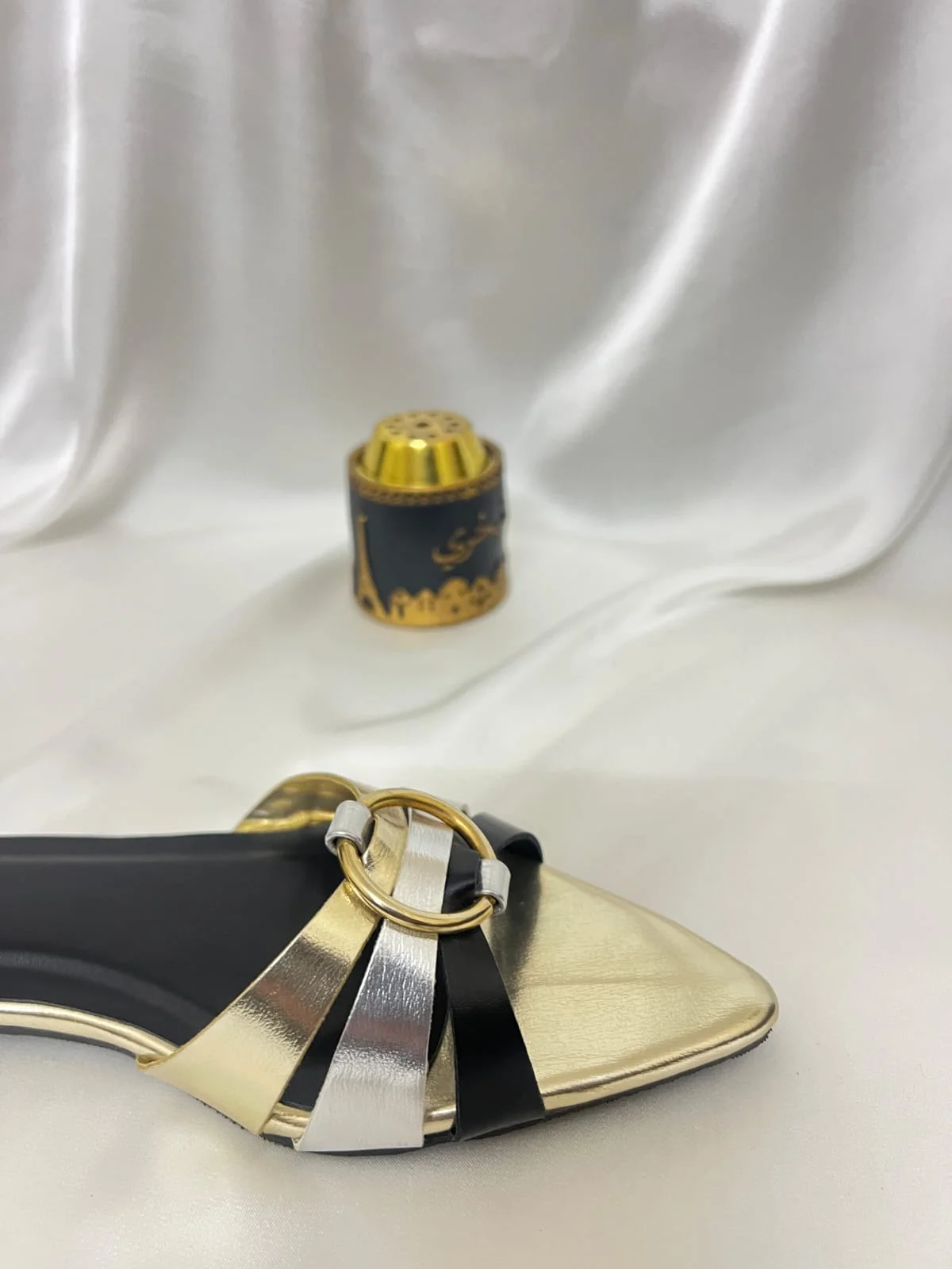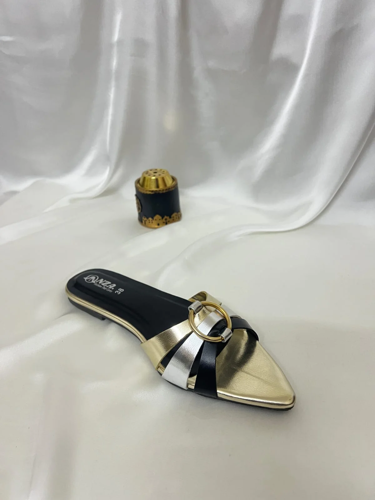 Elevate your style with effortless elegance. Step into sophistication with this chic flat slip-on featuring a pointed gold toe, sleek black and silver straps, and a statement gold ring accent. Perfect for adding a touch of glamour to everyday looks or completing your evening ensemble. Comfortable, stylish, and incredibly versatile — pair it with anything and love it every time. Available in sizes 36–41.