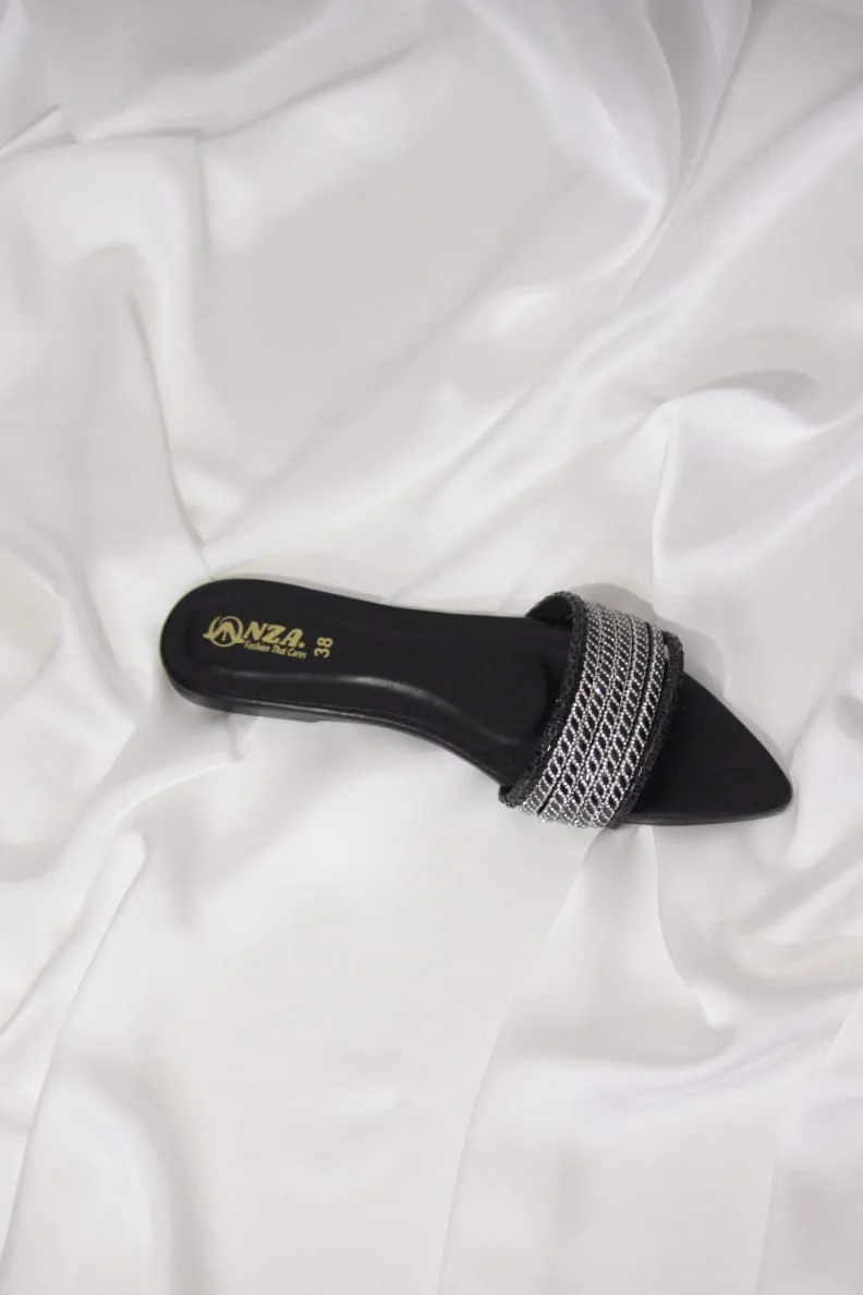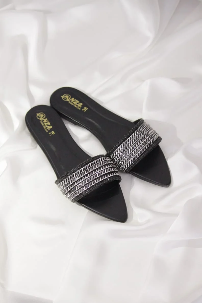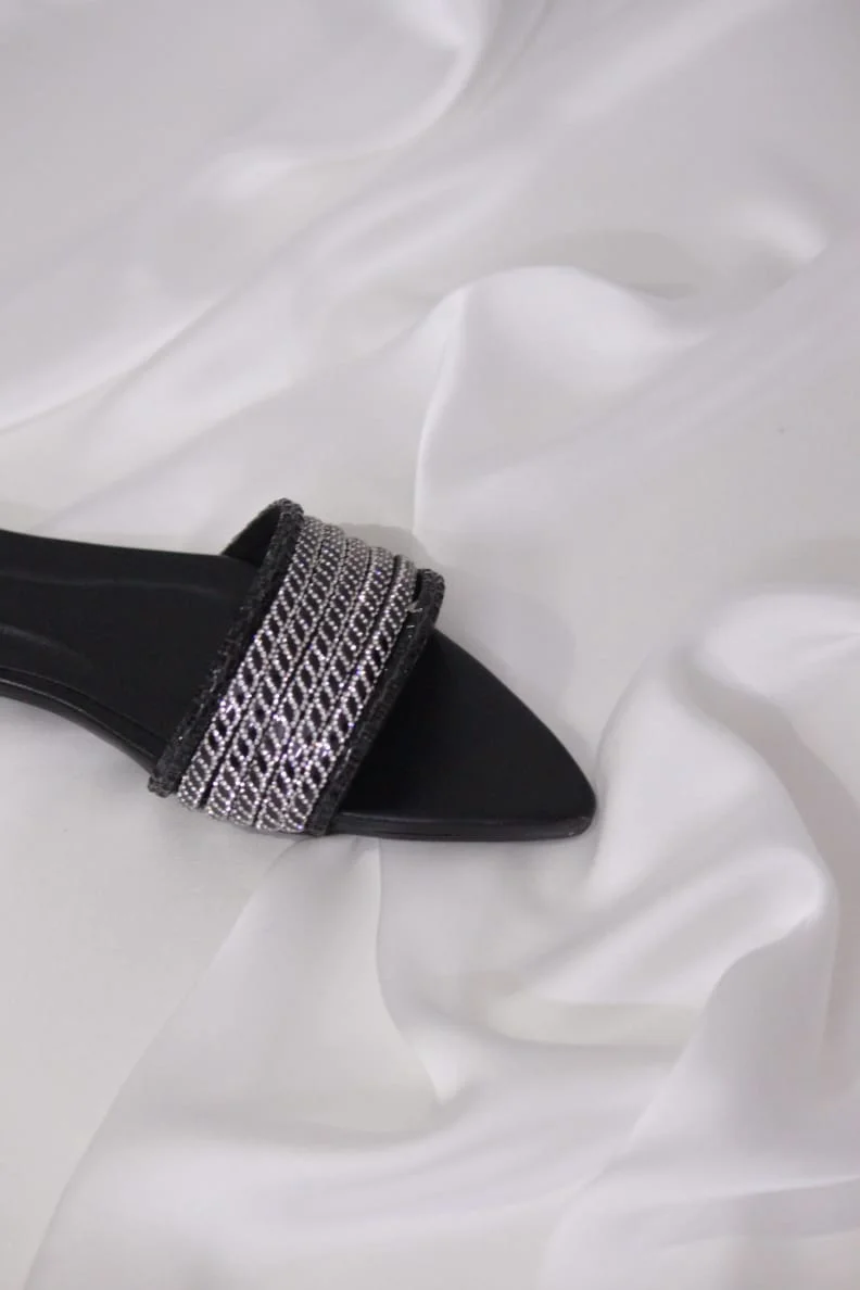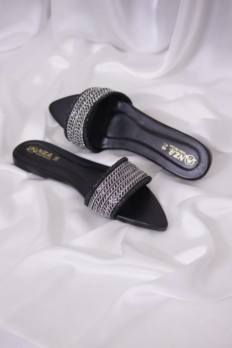 Elegance in every detail. Crafted in sleek black with a touch of sparkle, this slipper brings effortless luxury to your step. Perfect for evenings, outings, and moments you want to shine — comfort never looked this refined. Features a cushioned insole, non-slip sole, and embellished upper that catches the light with every step. Available in sizes 36–41.