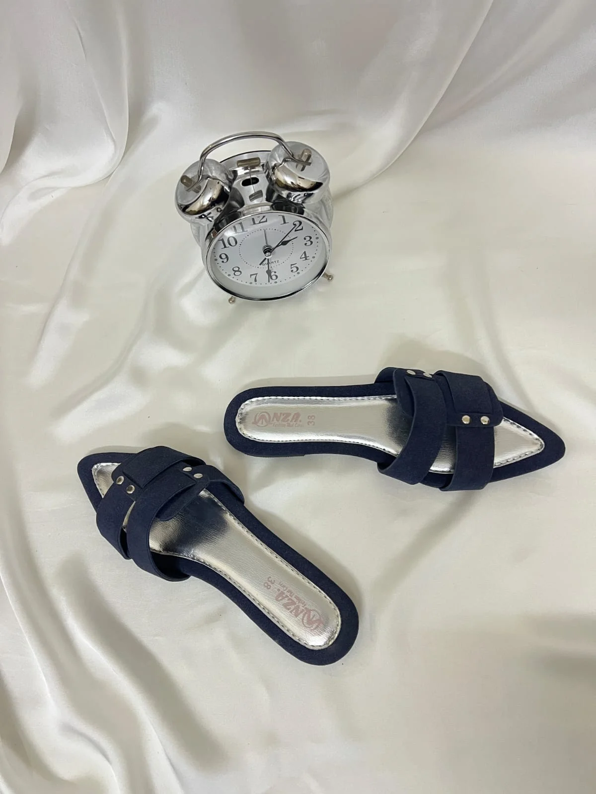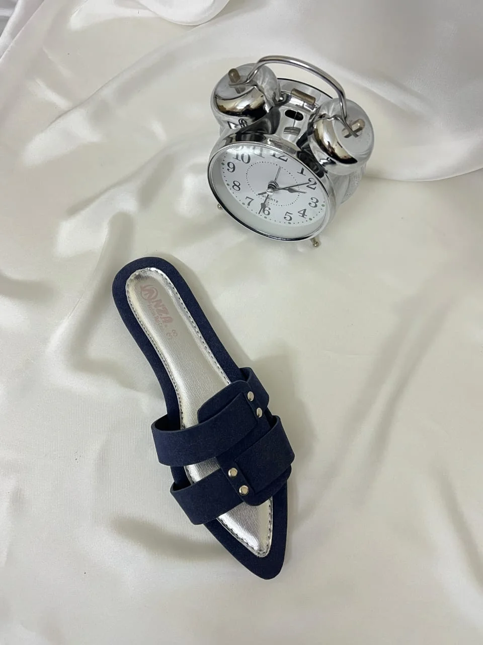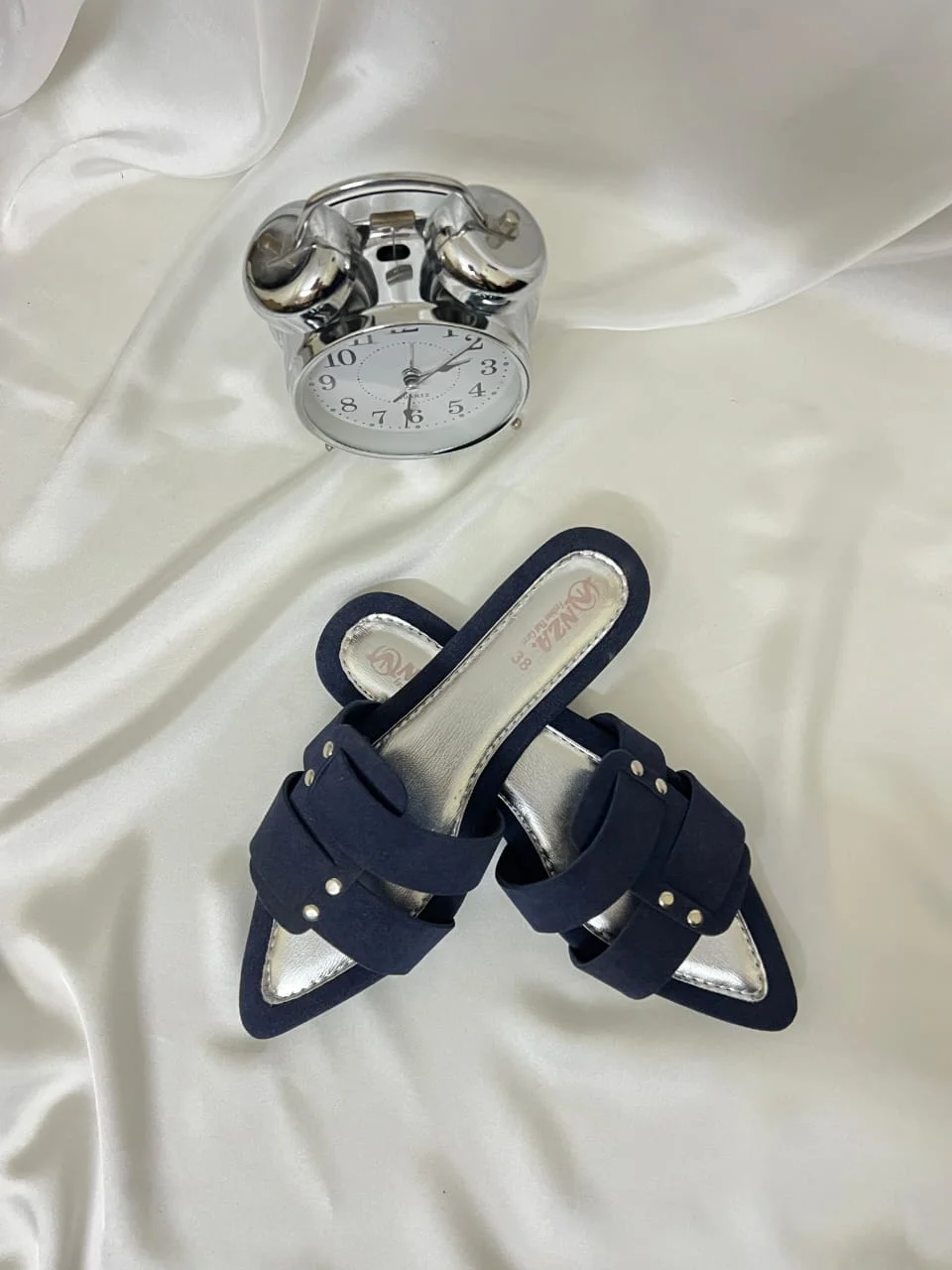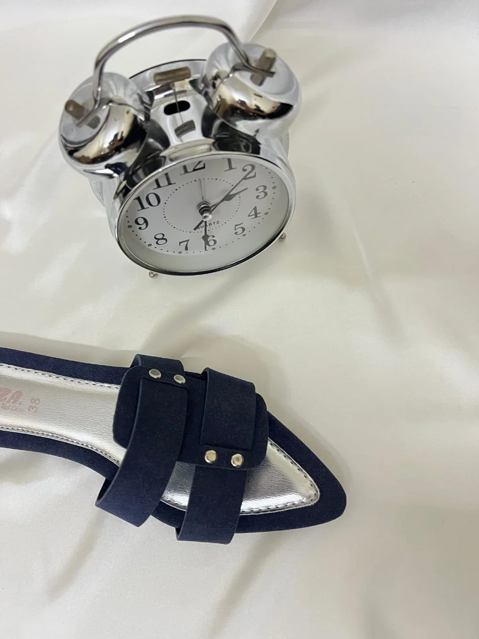 Time to step up your style. Introducing our Navy Double-Strap Pointed-Toe Flats — the perfect blend of sophistication and everyday comfort. Designed with a sleek pointed silhouette, soft navy upper, and chic double straps with metallic stud detailing. Adds instant polish to any outfit — whether you’re dressing up for the office or keeping it classy for a day out. Available in sizes 36–41.